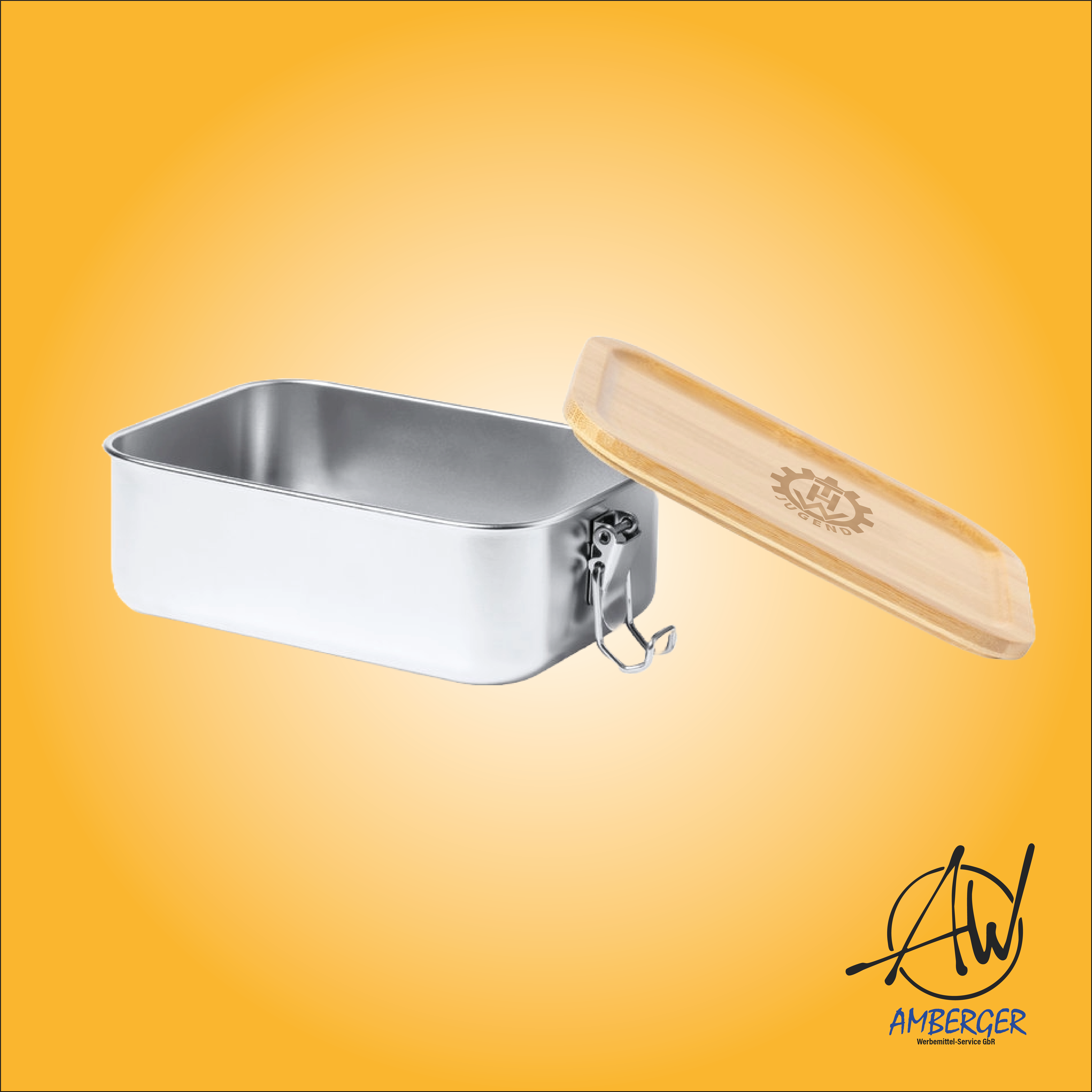 Brotbox/Lunchbox mit einem Fassungsvermögen von 800 ml, aus Edelstahl. Mit hermetischem Deckel aus Bambus und BPA-frei. Präsentiert in einer individuellen Kraft-Design-Box.